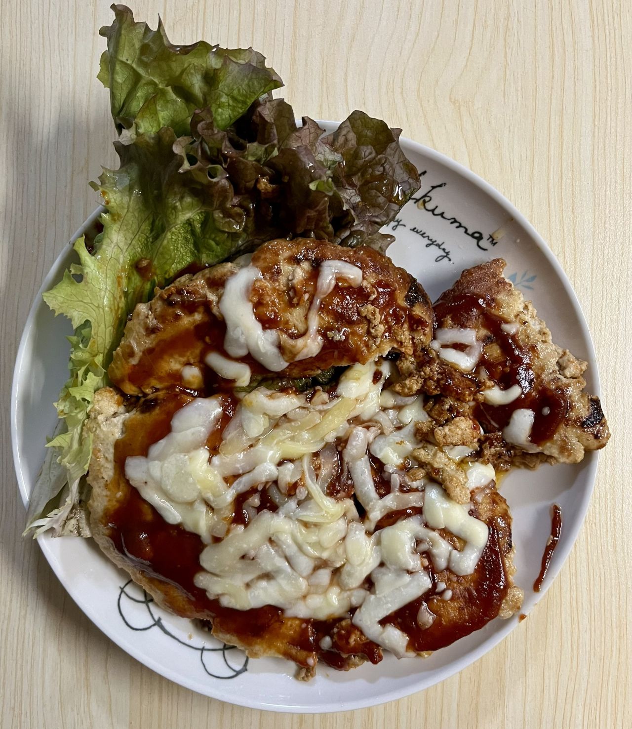 割れたのにもめげずソースとチーズを大量に!