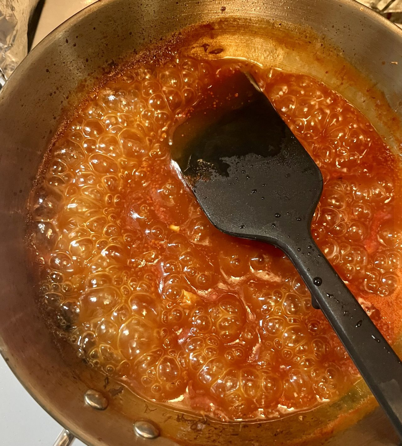 ケチャップのあんを加熱していくと半透明になってきます。これで出来上がり。