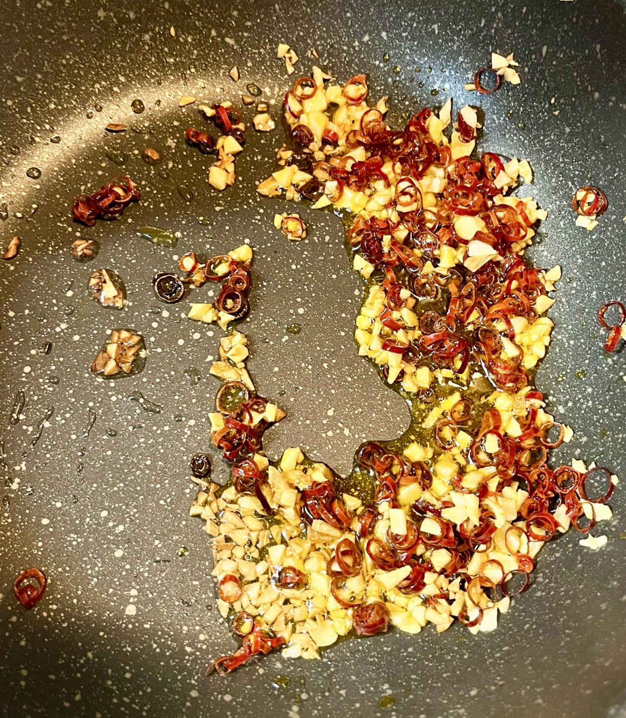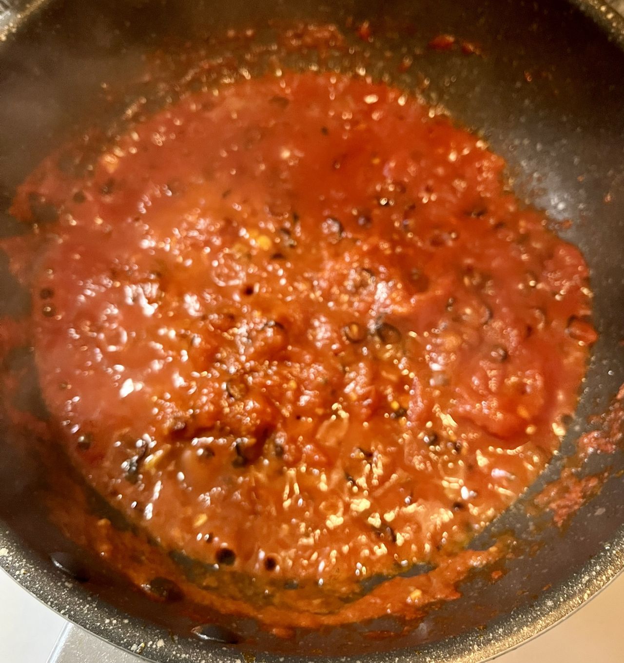 ホールトマトを潰して加熱しているところですが、よく見ると黒い物体がみえます。唐辛子、大半焦げました・・・。大失敗。原因は下の画像。