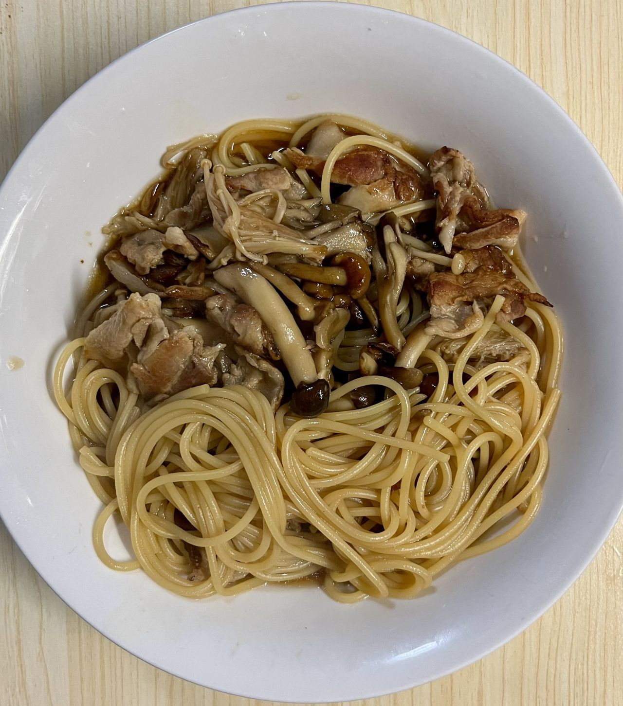 くまの限界食堂さんのレシピから【豚とキノコのスープスパ】を作ってみました。香ばしさが深い味わいのスパゲティ。すごく簡単。