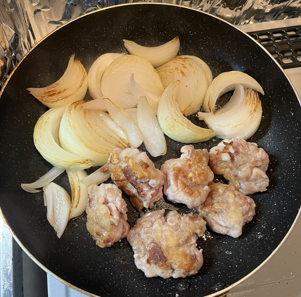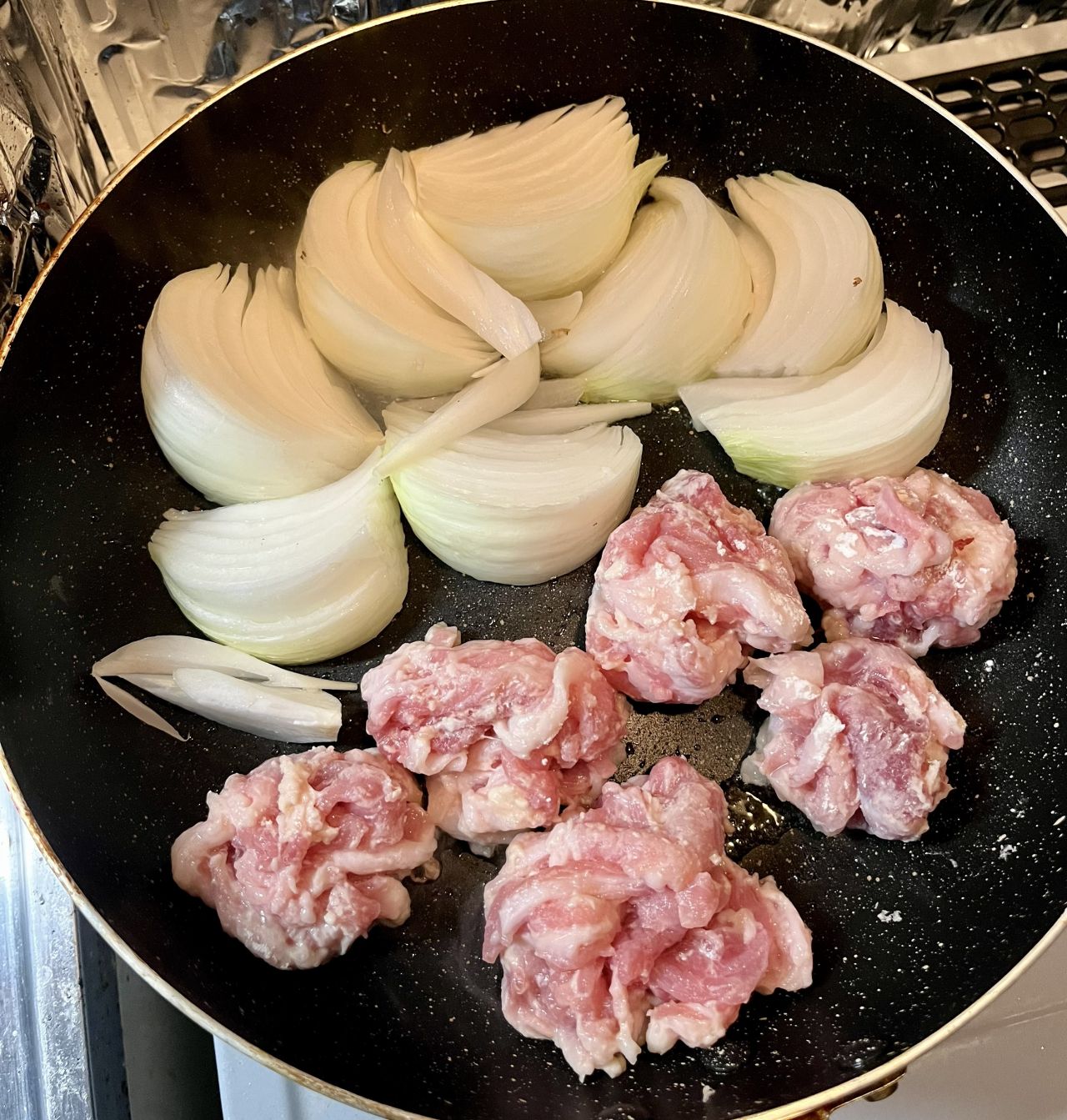 いきなり新玉ねぎのカットがダメだったのか崩れてしまいまして。豚小間もうまく円形にできませんでした。自分には難しかったようです。
