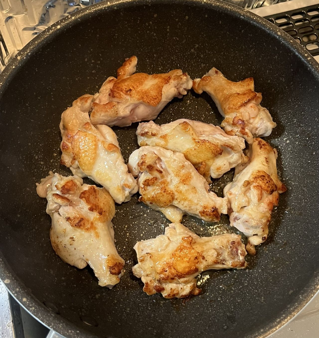 手羽元を焼く前の段取りで、骨に沿って切れ目をいれる段階がありますが、なかなか難しかったです。あんまりうまくできなかったかな。手羽元は本数が多いものしかなかったのでそのまま使用。