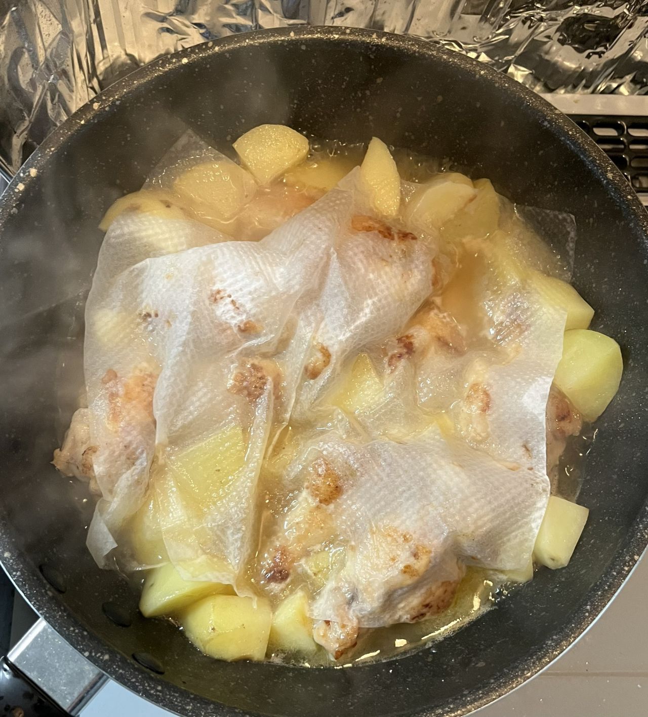 はじめてペーパーをかけて煮込みました。なるほどこれで乾かないわけですね。