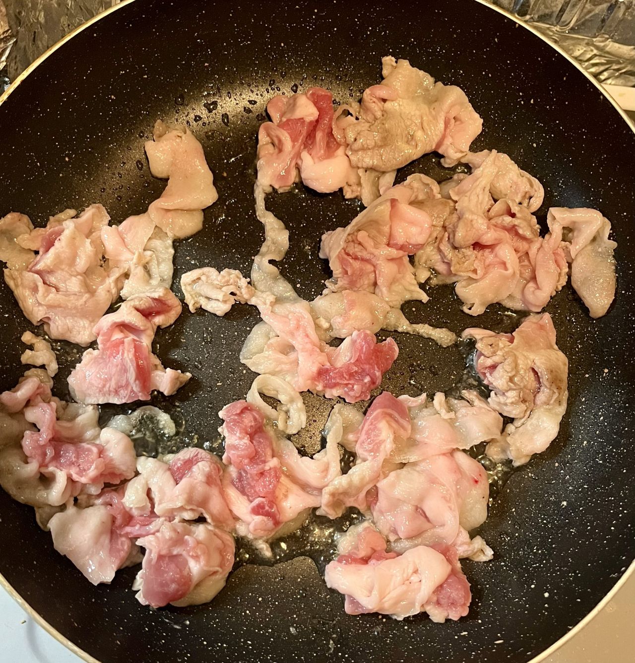 豚小間を炒めています。最近このコーナーでいろんな料理をつくるようになって豚小間を炒めても硬くならなくなりました。加減が進化!