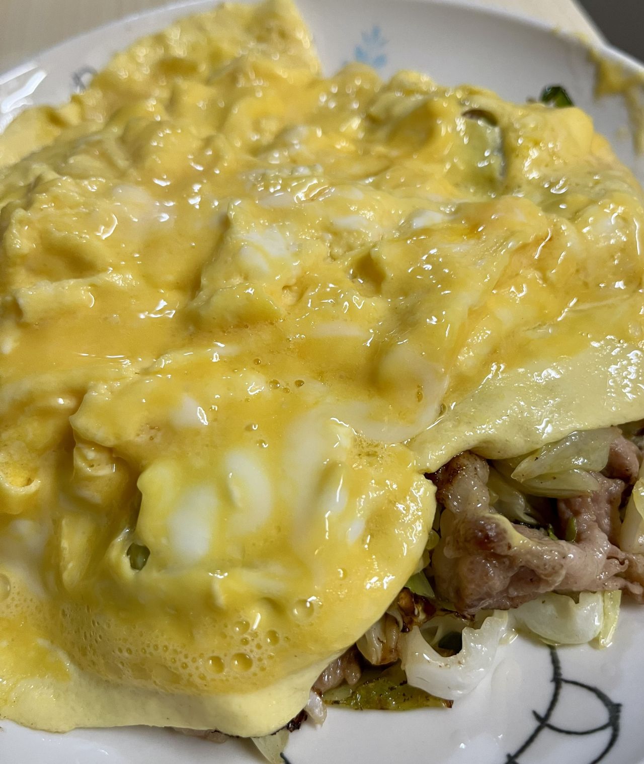 おいしい!半熟卵と豚肉。キャベツを一緒に食べるととてもまろやかな味です。大満足。一気に食べました。ご飯にぴったりです。忙しいとき、ああ、ちょっとやるきしねーってときにおススメです。キャベツもたくさん入っているので野菜も取れますし。ハイボールも合いそうです。作っていて感じたのは、野菜の水分を飛ばすこととふわりと卵を焼くことですかね。