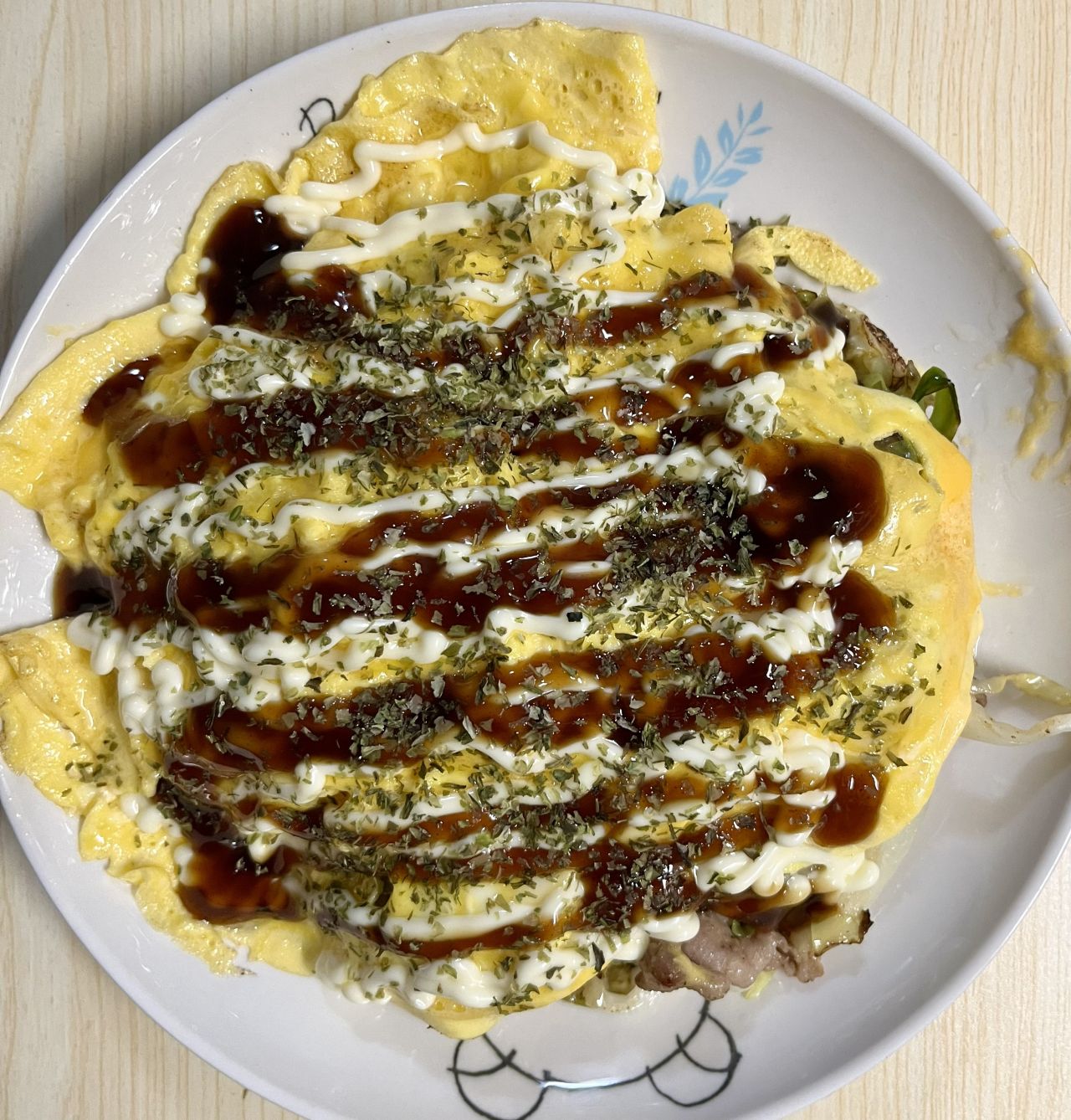 かっちゃんなねるさんのレシピから焼いて乗っけるだけ「オム豚キャベツ」をチョイス。お好み焼きを思い出しやすが、半熟卵がフワフワでソースとマヨネーズをうまく取り込んでいます。大成功!