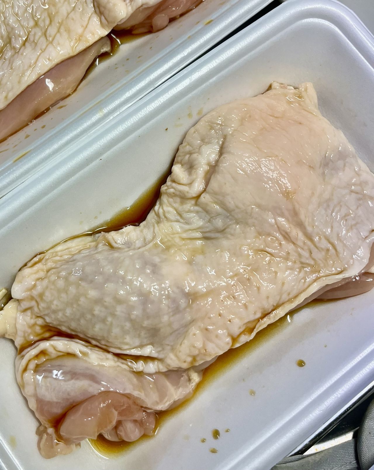鶏肉に砂糖をすり込んでから酒、醤油に漬け込みます。動画のとおり砂糖はザラザラ感がなくなるまでしっかりとすり込みました。いい感じのサイズのバットが欲しいです。