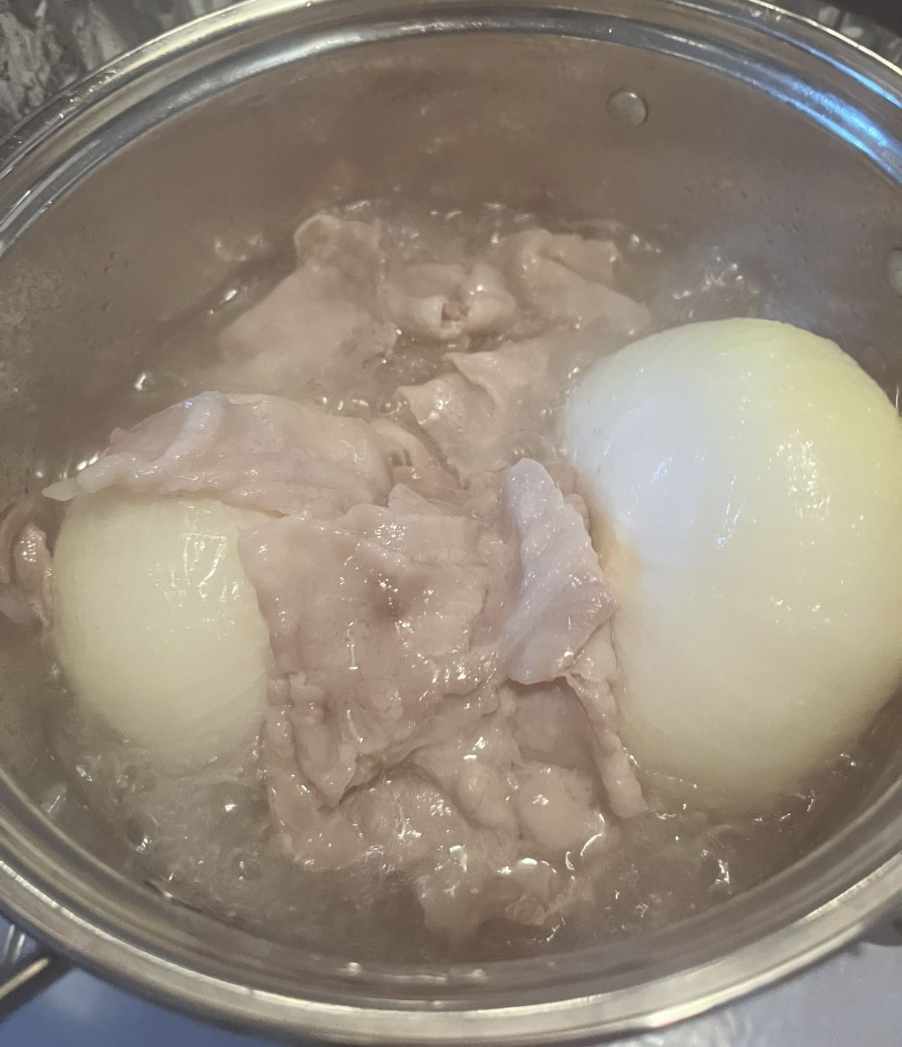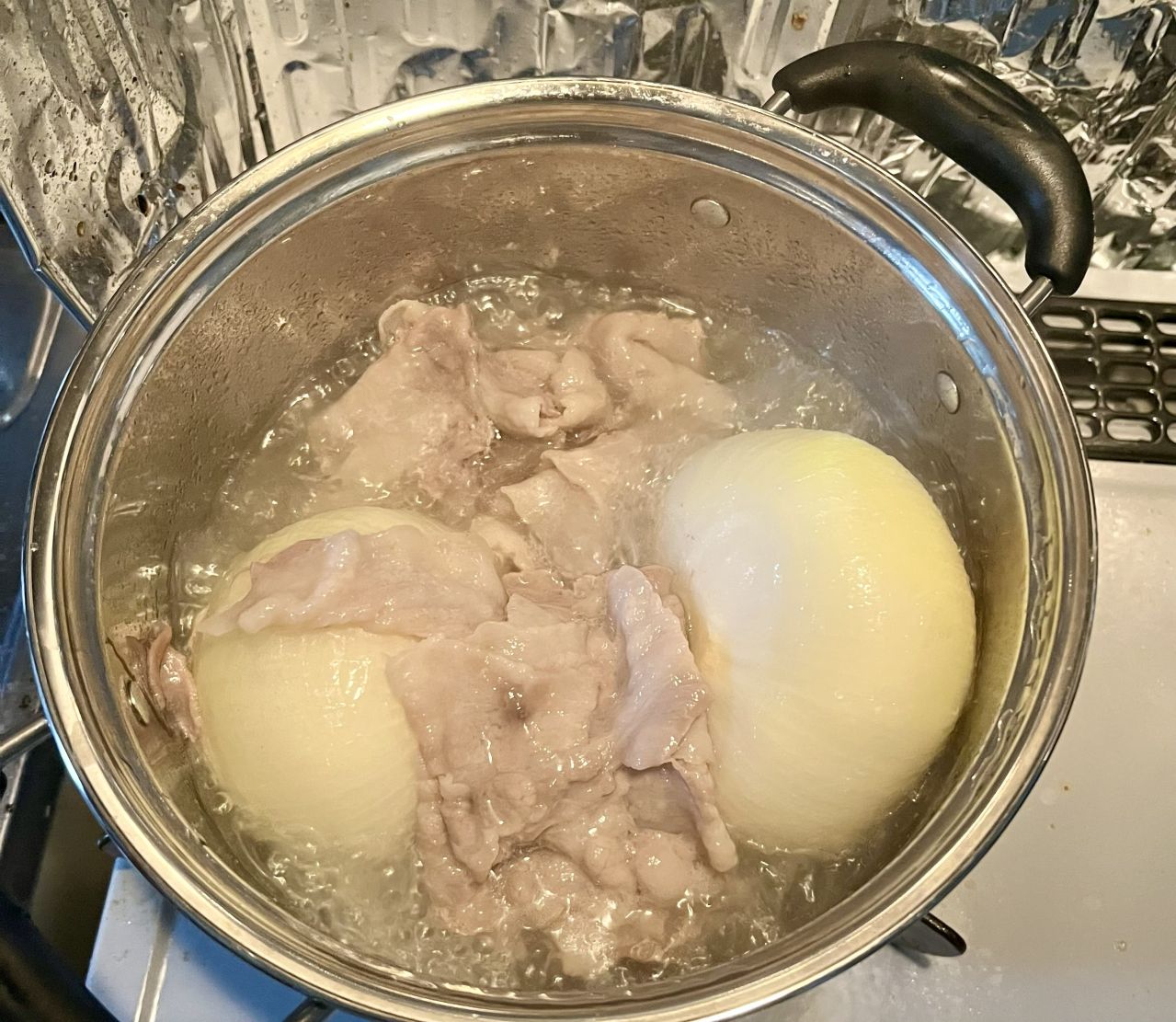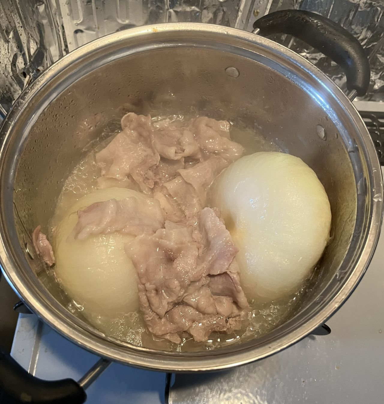 大きめの新玉ねぎをドーンと鍋へ。バラ肉とグツグツ。これだけで美味しそうな香りが・・・