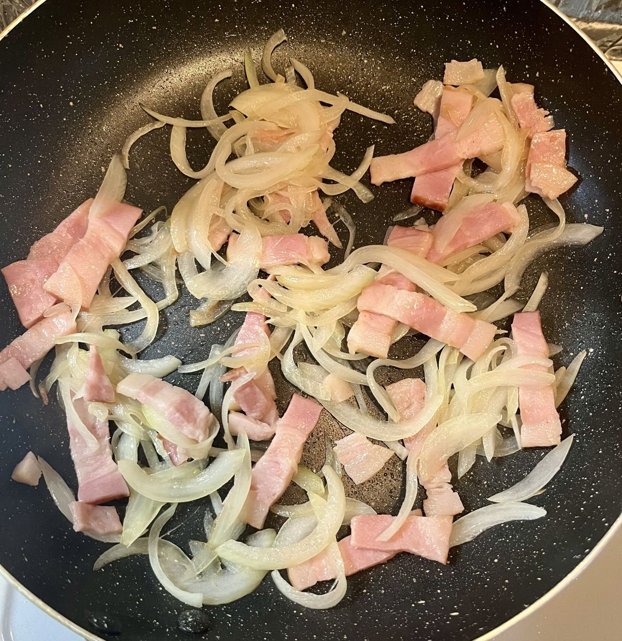 ベーコンと玉ねぎを炒めているところ。それほど炒めなくてOK。