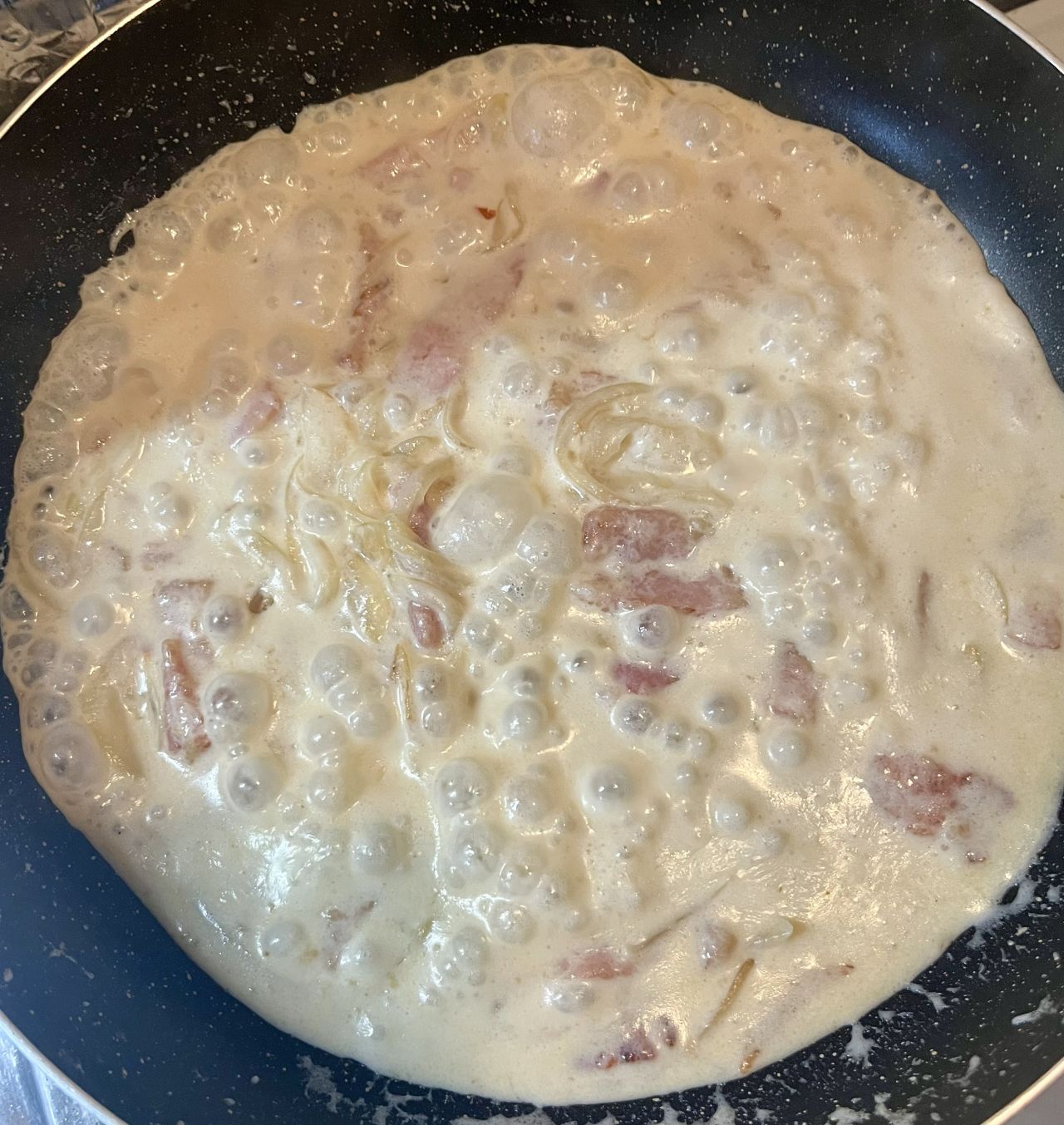 薄力粉をベーコン、玉ねぎにまぶしてから複数回に分けて牛乳入れていくときれいにだまにならずにできました。ちょっと煮えたぎってますね。